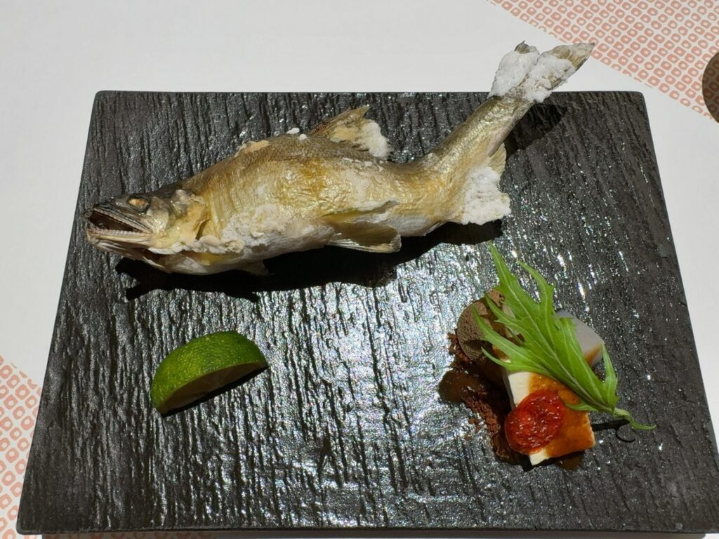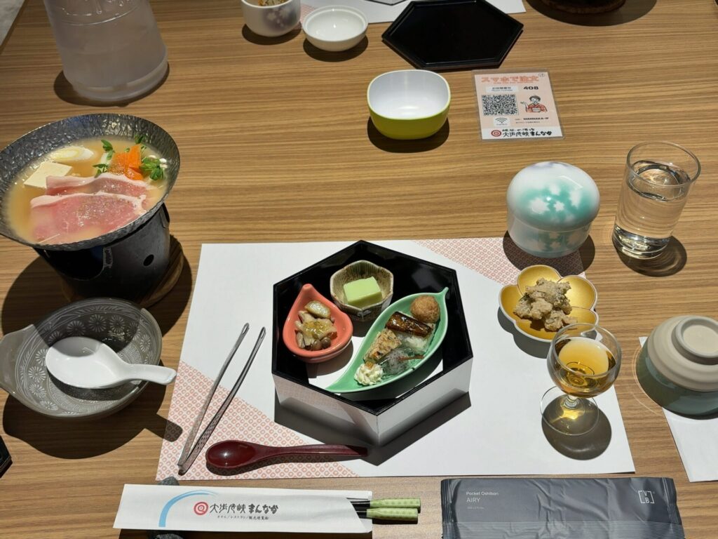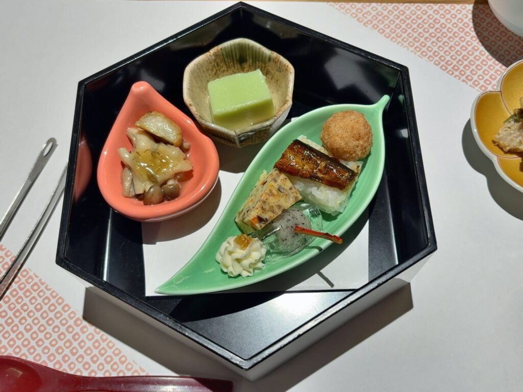 前菜は、鮎小袖寿司やすだち豆腐など地元の食材を使った料理が少しずつ盛り付けられ見た目と色々な味、両方を楽しめました。