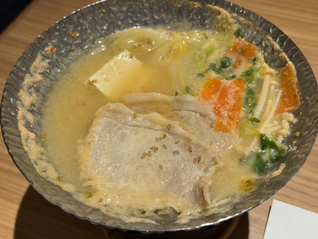 鍋物は、極味豚を使用した白味噌仕立てでやさしい味わいの出汁と豚肉の旨みがよく合っていました。