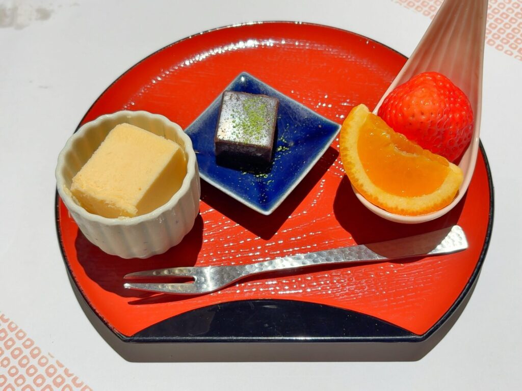 水物の「柚子で作った自家製パルフェ」は、柚子の爽やかな酸味がありさっぱり味。自家製生チョコレートは、デザートに丁度よい大きさでなめらかな口どけで濃厚な味わいでした。