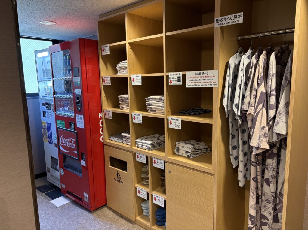 エレベーターのすぐ横に交換用の浴衣とスリッパが用意してります。奥は自販機ですね。