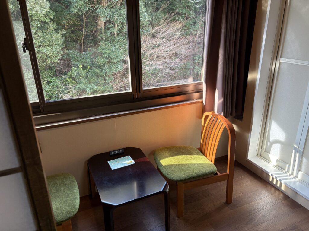 和室の宿では、夕食中にスタッフの方が布団を敷きに部屋へ入ることも多いですが、「大歩危峡まんなか」では滞在中にスタッフの方が部屋へ入ることはありません。セキュリティ面でも安心して過ごせました。