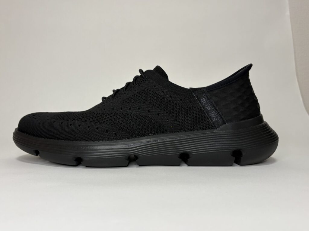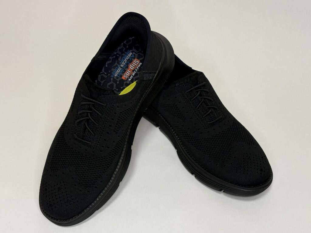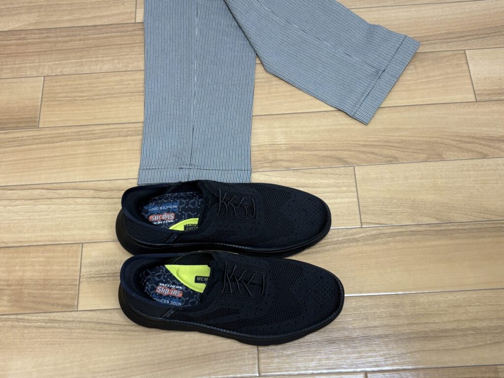 結論から言うと、スケッチャーズ スリップインズ「GARZA-PALMA(ブラック)」はビジネスカジュアルに十分合います。