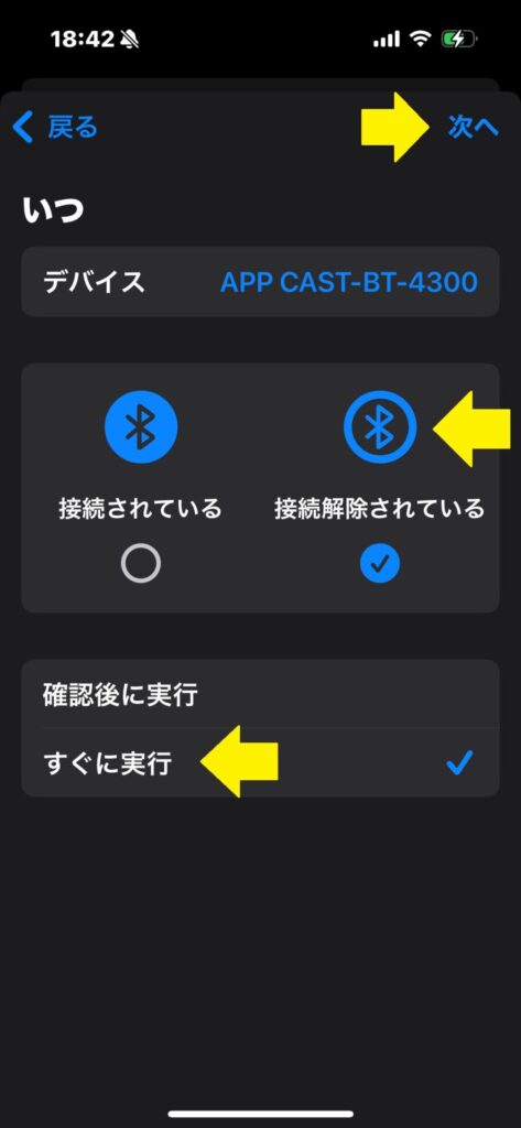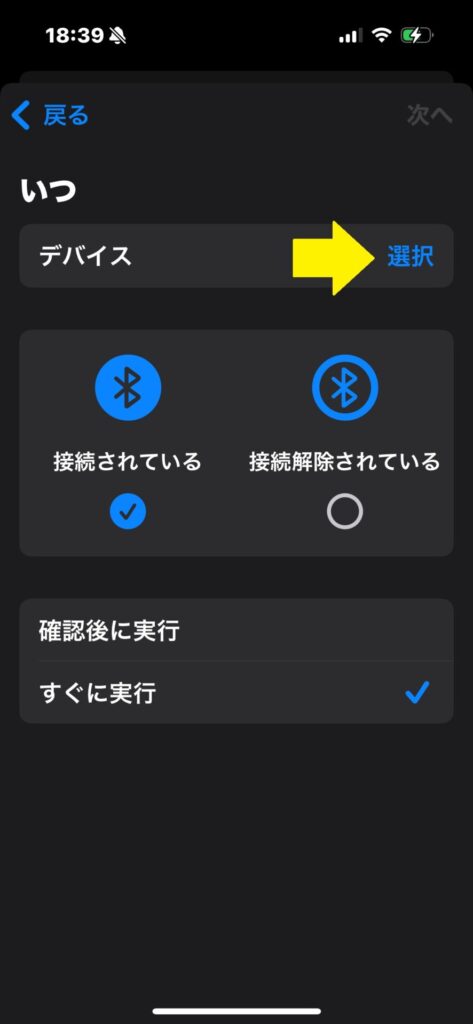 「接続されている」と「すぐに実行」に✔し、「次へ」をタップします。