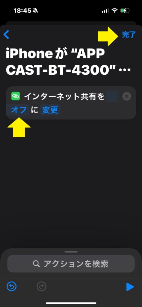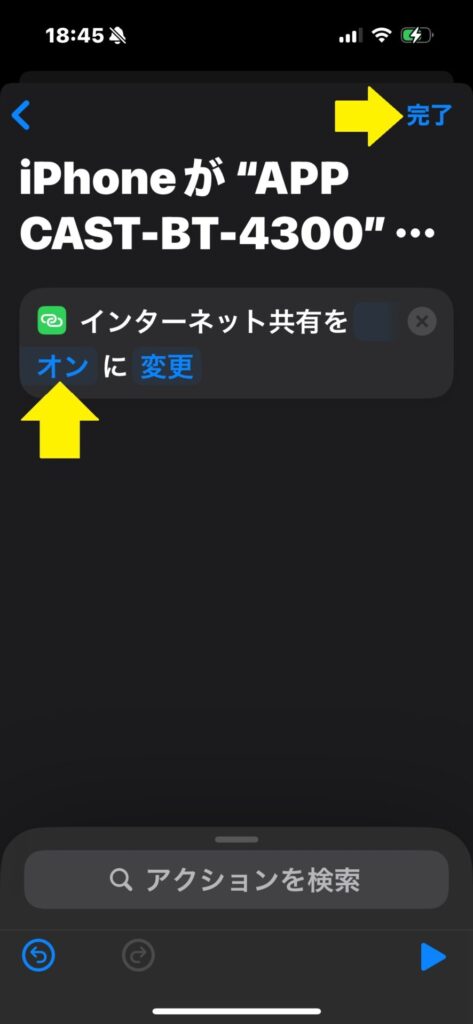 これで「APP CAST-BT-4300」とiPhoneがBluetooth接続されると自動でiPhoneの「インターネット共有」が「オン」になります。