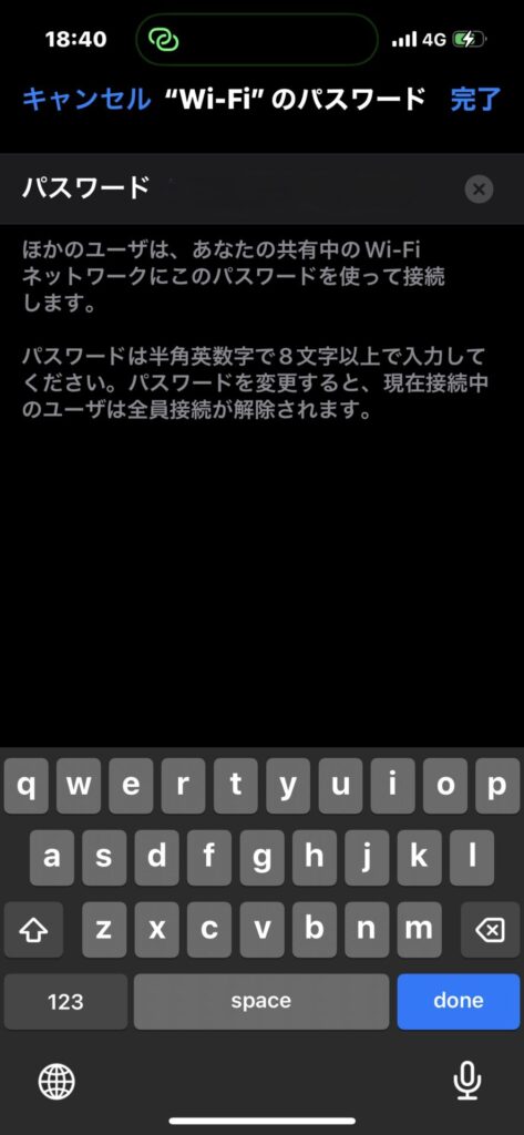 インターネット共有をオンをタップして「オン」にして「完了」をタップします。